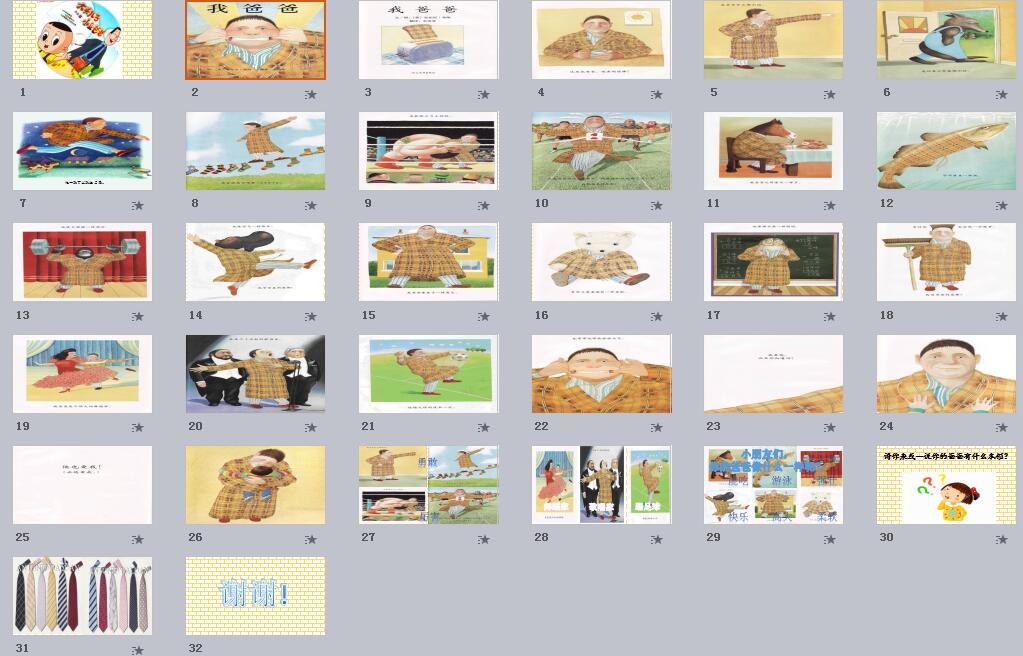 1. 學會觀察繪本,了解爸爸的各種愛好及他勇敢的性格特征。
