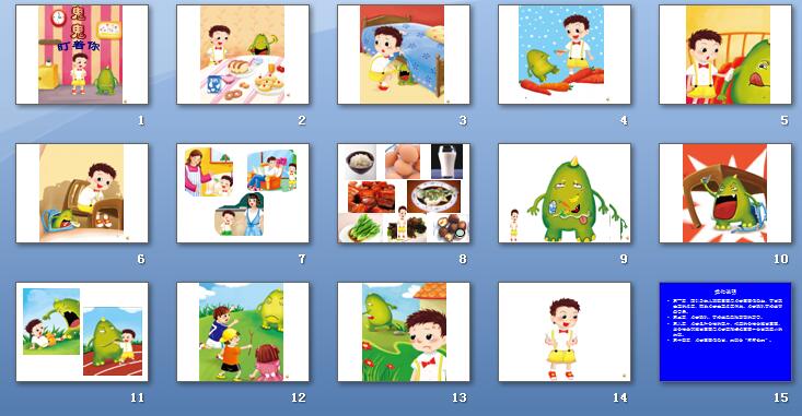 故事通過講述挑食的太郎和小怪獸鬼鬼之間的故事,讓孩子們懂得了挑食的危害,知道要樣樣東西都愛吃的道理。
